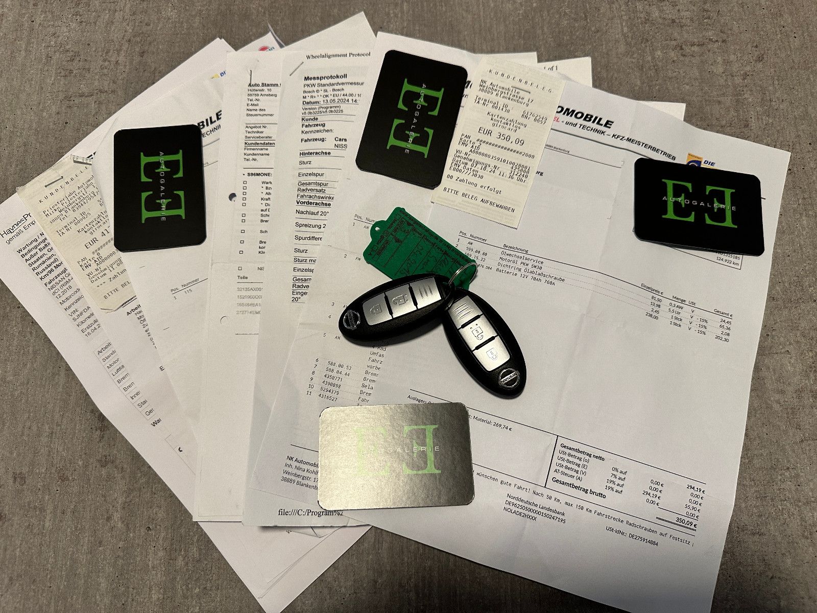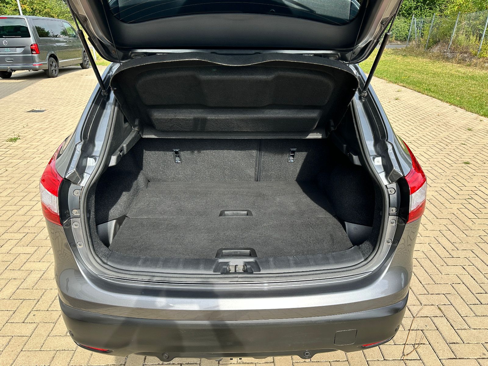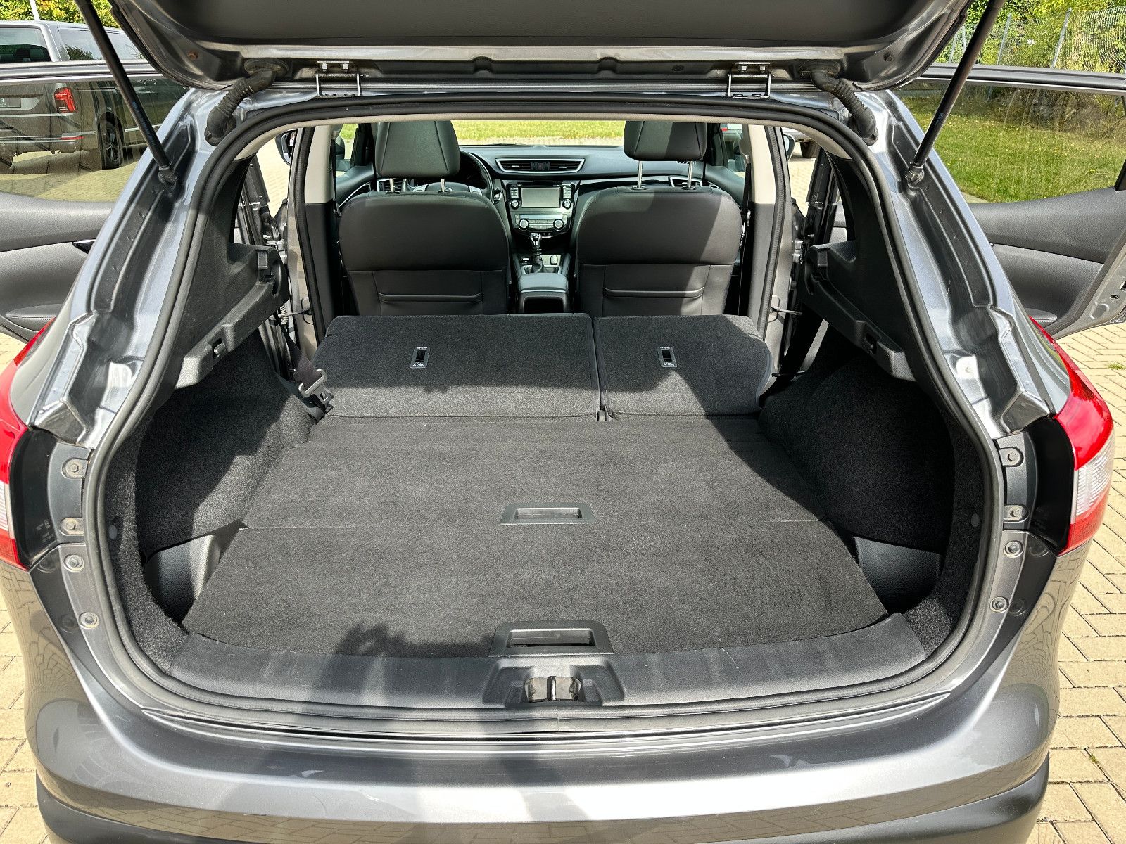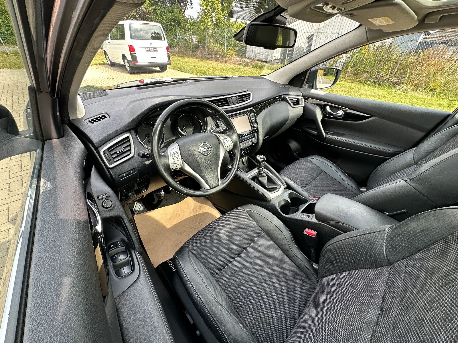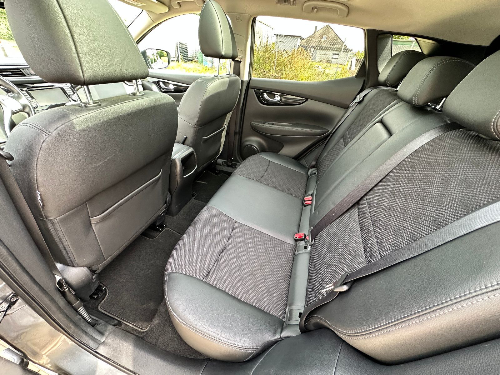 • Weitere Ausstattung: 3. Bremsleuchte, Airbag Beifahrerseite abschaltbar, Airbag Fahrer-/Beifahrerseite und Seitenairbag vorn, Ambiente-Beleuchtung, Audio Navigationssystem Nissan Connect mit Touchscreen-Farbdisplay, Audiobedienung am Lenkrad, Audiosystem: Radio mit CD- und MP3-Player, Automatische Fahrlichtschaltung, AUX-IN-Anschluss (AUX-IN), Außenspiegel elektr. anklappbar, Außenspiegel elektr. verstell- und heizbar, Außenspiegel Wagenfarbe, Außentemperaturanzeige, Blinkleuchte in Außenspiegel integriert, Bordcomputer, Bremsassistent (Nissan Brake-Assist), Coming-Home-Lichtfunktion (Friendly Lightning), Dachreling silber, Einparkhilfe hinten, Einparkhilfe vorn, Elektr. Bremskraftverteilung (EBD), Fahrassistenz-System: Aktive Fahrkomfortregelung (Fahrwerksdämpfung), Fahrassistenz-System: Autonomer Notbrems-Assistent, Fahrassistenz-System: Berganfahr-Assistent, Fahrassistenz-System: Fernlichtassistent, Fahrassistenz-System: Kurvenbremskontrolle (Aktive Spurkontrolle), Fahrassistenz-System: Spurhalteassistent, Fahrassistenz-System: Verkehrszeichenerkennung, Fahrer-Informations-System (FIS) mit Farbdisplay, Fensterheber elektrisch vorn + hinten, Fernentriegelung Tankklappe, Freisprechanlage Bluetooth, Frontscheibe heizbar, Frontscheibe Verbundglas, Gepäckraumabdeckung / Rollo, Getränkehalter in Mittelkonsole, Gurtstraffer, Handschuhfach beleuchtet, Heckscheibe heizbar, Innenraumfilter: Pollenfilter, Innenspiegel mit Abblendautomatik, Isofix-Aufnahmen für Kindersitz, Kamerasystem Around View, Karosserie: 5-türig, Klimaautomatik 2-Zonen, Kopf-Airbag-System, Kopfstützen vorn und hinten verstellbar, Lendenwirbelstütze Sitz vorn links, Lenksäule (Lenkrad) höhen-/längsverstellbar, Leseleuchte vorn, LM-Felgen, Mittelarmlehne hinten, Motor 1,6 Ltr. - 96 kW dCi Turbodiesel KAT, Nebelschlussleuchte, Parkbremse elektrisch, Radstand 2646 mm, Reifen-Reparaturset, Reifendruck-Kontrollsystem, Rücksitz geteilt/klappbar, Schadstoffarm nach Abgasnorm Euro 5, Schalt-/Wählhebelgriff Leder, Schaltpunktanzeige, Scheibenwischer mit Intervallschaltung, Sitz vorn links elektr. verstellbar, Sitz vorn links höhenverstellbar, Sitz vorn rechts höhenverstellbar, Sitzbezug / Polsterung: Teilleder, Sitzheizung vorn, Sonnenblenden mit Spiegel (beleuchtet), Start-Stop-Knopf, Start/Stop-Anlage, Steckdose (12V-Anschluß) in Mittelkonsole, Türgriffe innen verchromt, Verglasung hinten abgedunkelt, Wärmeschutzverglasung mit UV-Schutz